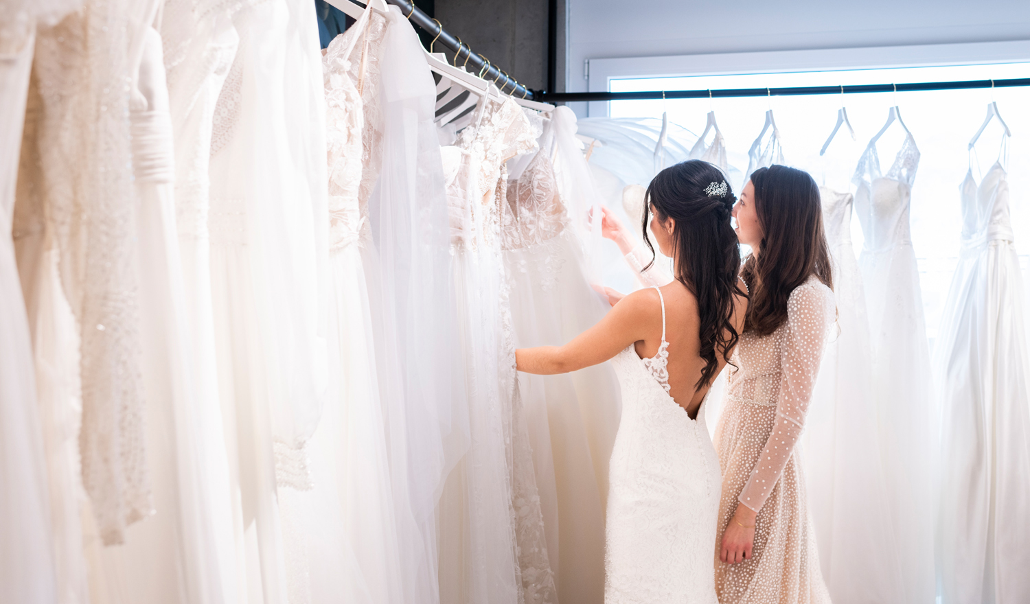 Élégants, modernes et parfaitement adaptés au style contemporain du showroom, les tubes et raccords urbains recouverts d'un revêtement noir mettent merveilleusement en valeur les superbes robes exposées dans cet espace.
