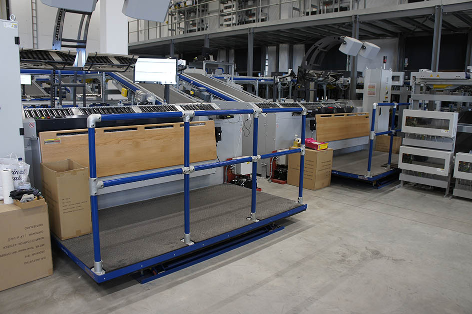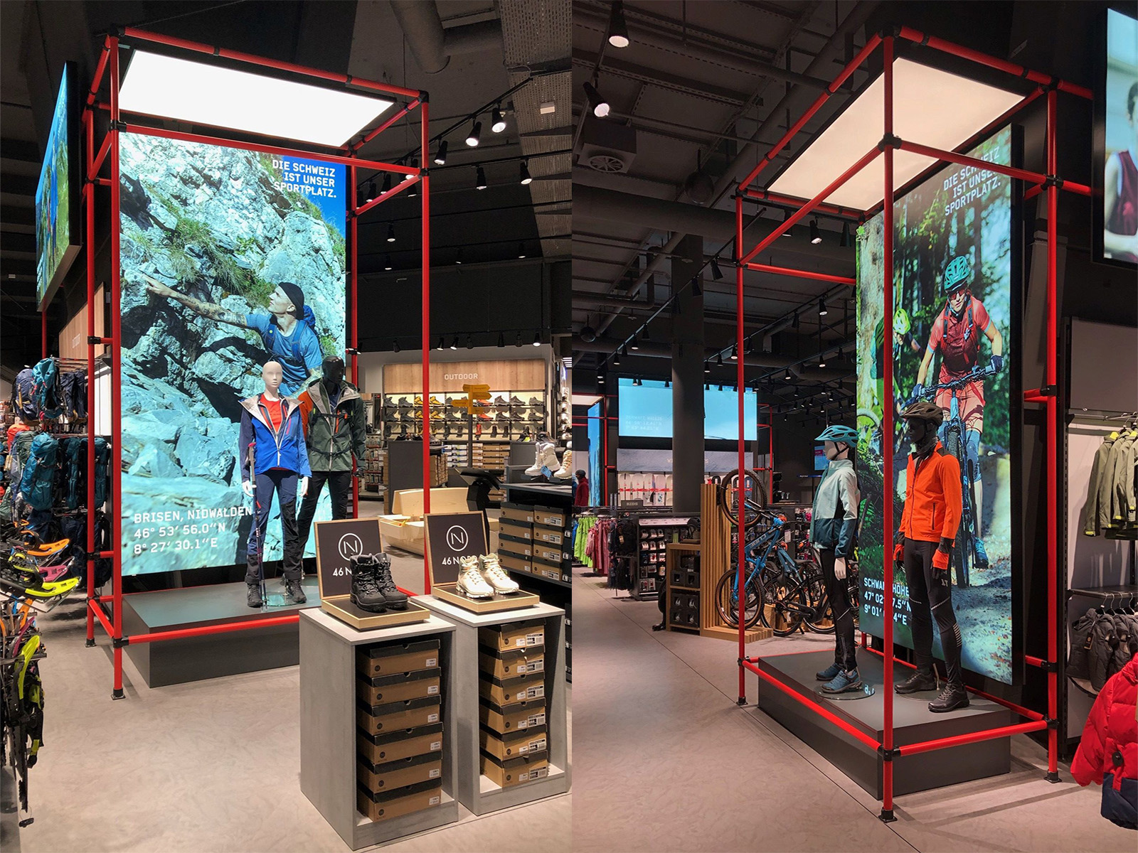 Ces murs d'écrans interactifs ont été construits pour trois magasins Ochsner Sport. Les tubes sont recouverts d'une peinture en poudre et les connecteurs proviennent de notre gamme noire.