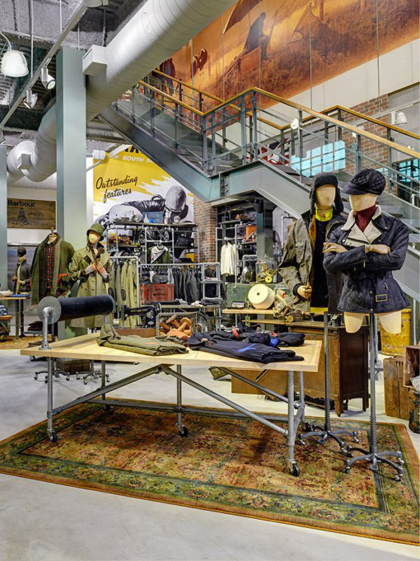 Concept d'aménagement de magasin urbain à Zurich Europaalee. Grille de plafond sophistiquée, cloisons et éléments décoratifs supplémentaires en raccords et tubes en acier.